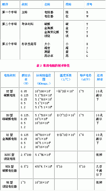 为了区别不同种类的电阻,常用几个拉丁字母表示电阻类别,如图1所示。第一个字母R表示电阻,第二个字母表示导体材料,第三个字母表示形状性能。上图是碳膜电阻,下图是精密金属膜电阻。表1列出电阻的类别和符号。表2是常用电阻的技术特性